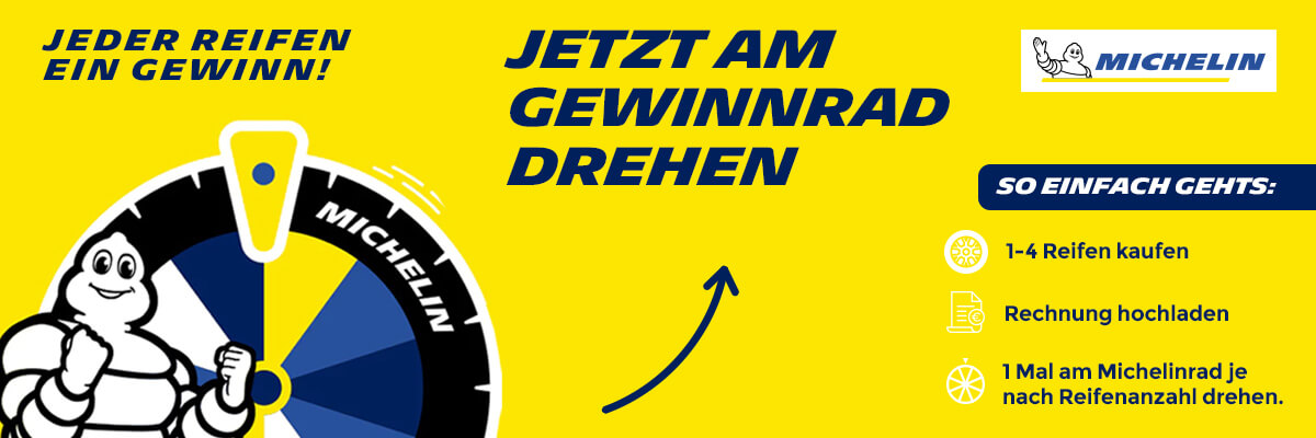 Vom 1. Januar bis zum 31. Dezember 2024 haben Sie die Möglichkeit, an unserem exklusiven Michelin Gewinnspiel teilzunehmen. Kaufen Sie dazu einfach einen MICHELIN Aktionsreifen für PKW und LLKW, Motorrad oder Roller im Zollbereich von 13 bis 23 Zoll bei Ihrem bevorzugten Händler. Bitte beachten Sie, dass Erstausrüstungs-, Oldtimer- und Rennreifen von dieser Aktion ausgeschlossen sind.